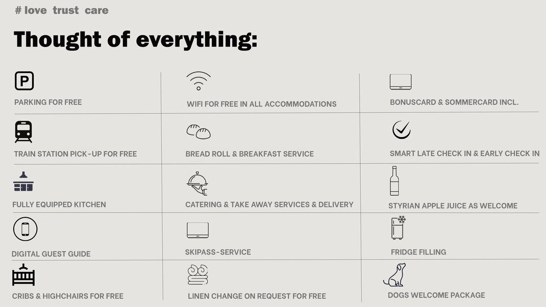 WE LOVE TO SERVICE YOU! This means all-round service, having time for you, creativity & innovation to give you unforgettable vacation experiences and to offer one or the other extra, which is so good for the soul, especially on vacation. If you are looking for conversation, you will find it, if you need guidance and help, you will be helped, if you are completely satisfied, you can enjoy your “4 vacation walls” undisturbed - that is the dimensional Sun Lodge feeling!