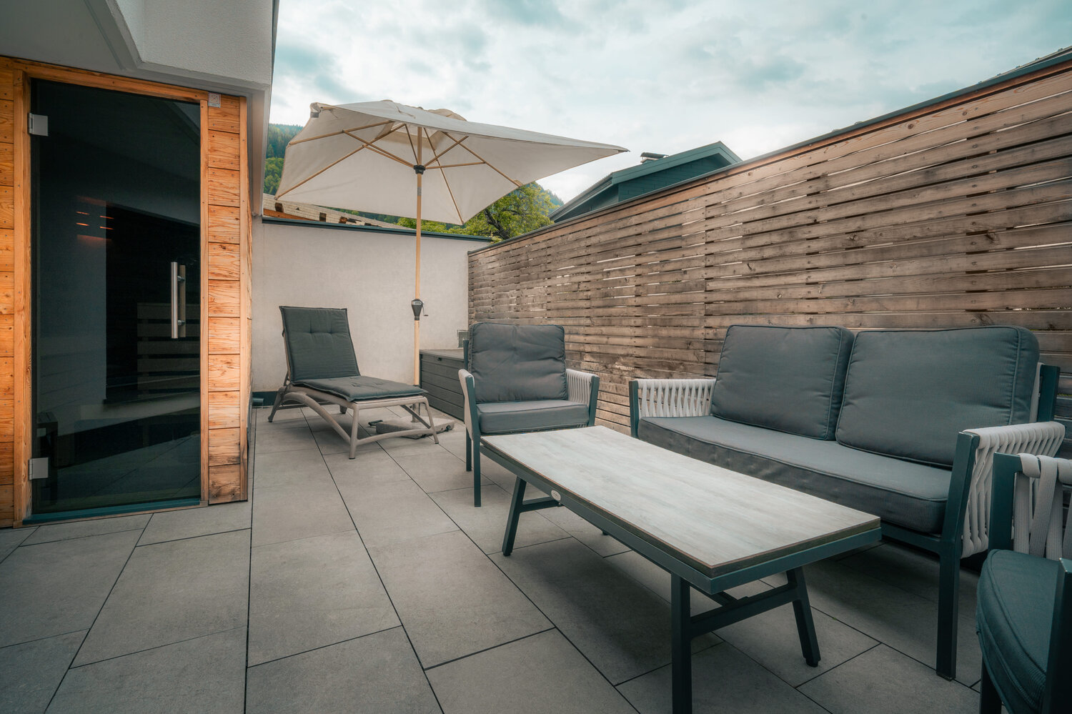 • Outdoor Sauna auf der 38,84 m² Terrasse mit Gartenmöbel