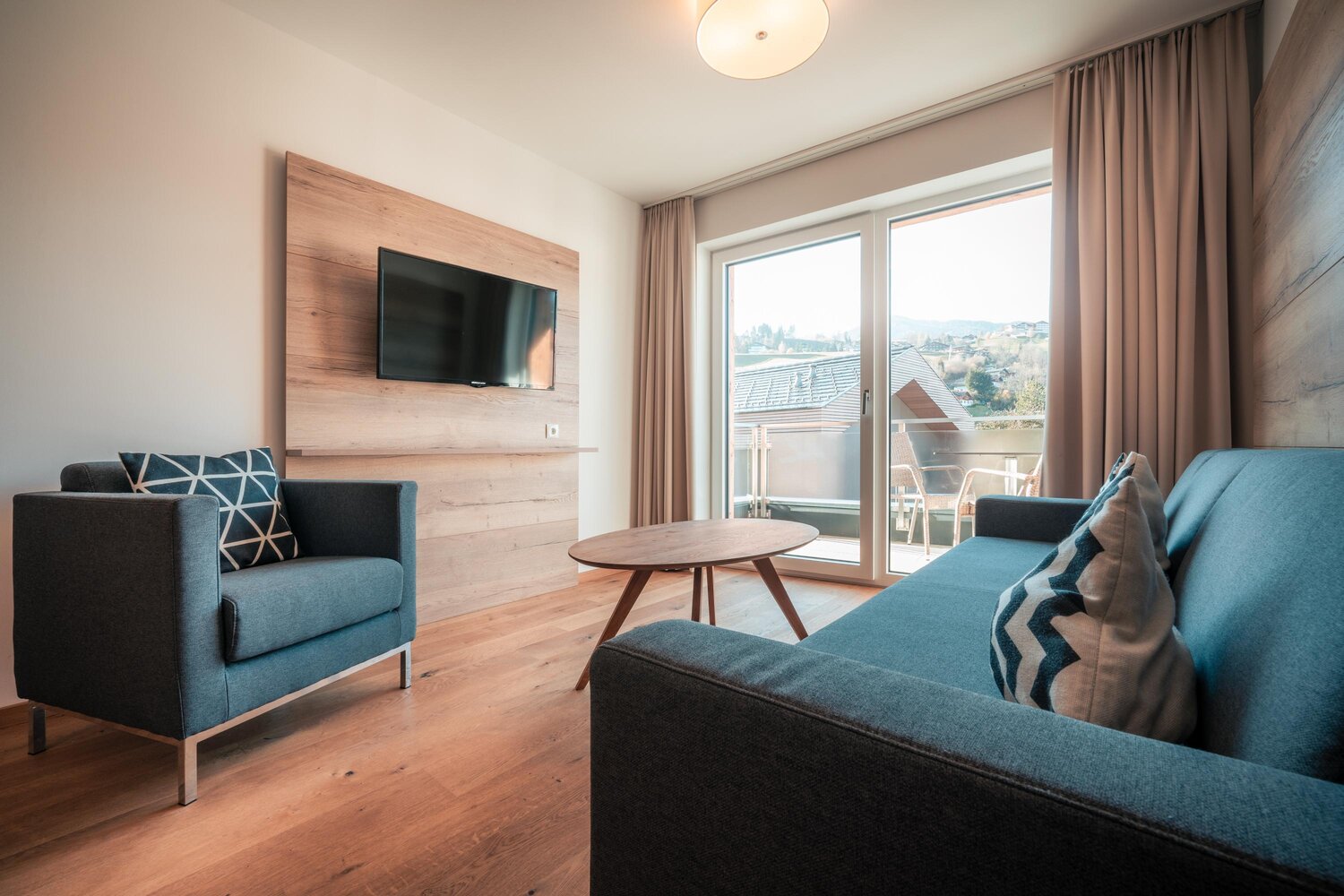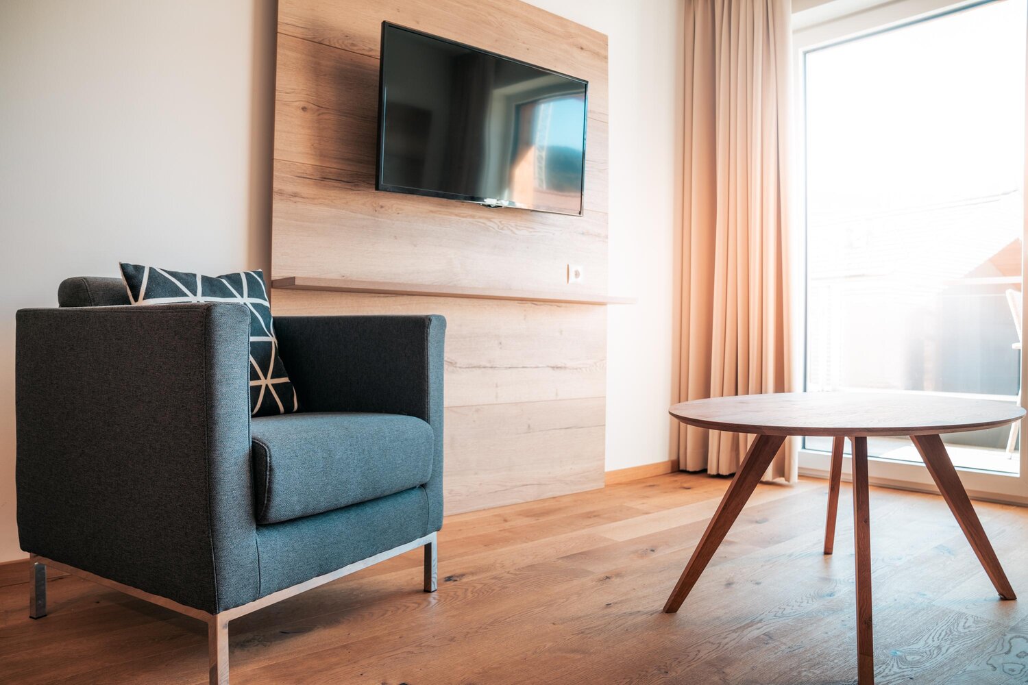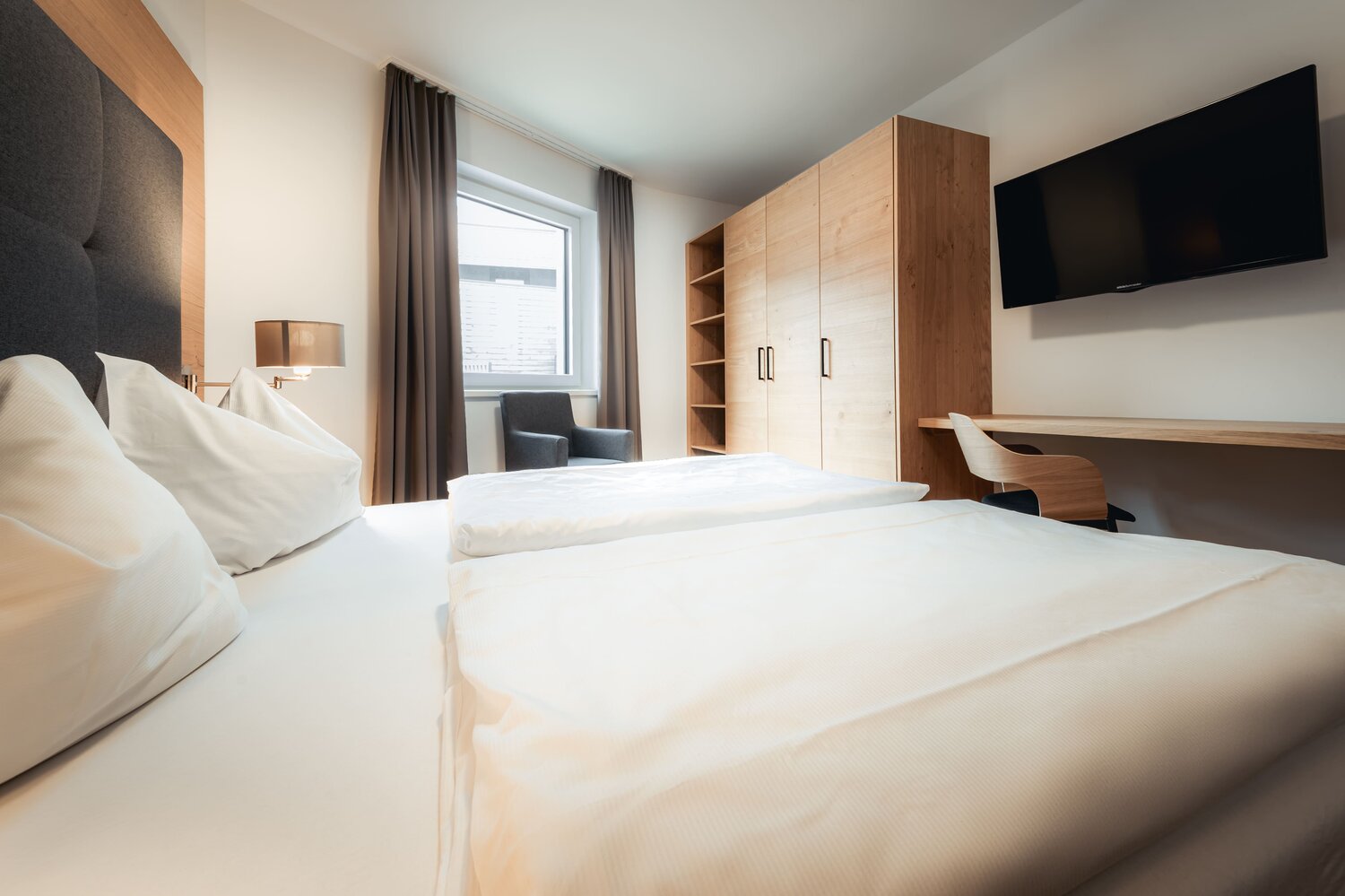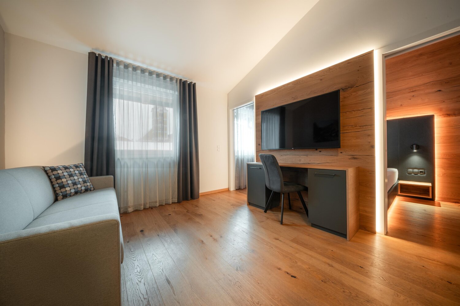 Modernes Hotelzimmer mit Sofa, Schreibtisch und TV