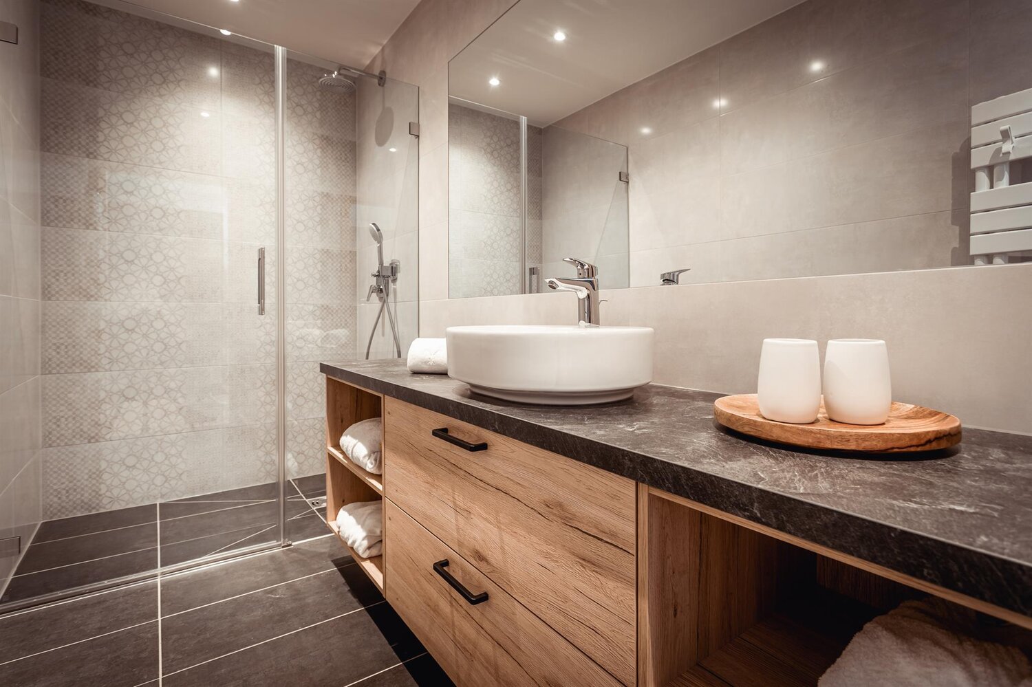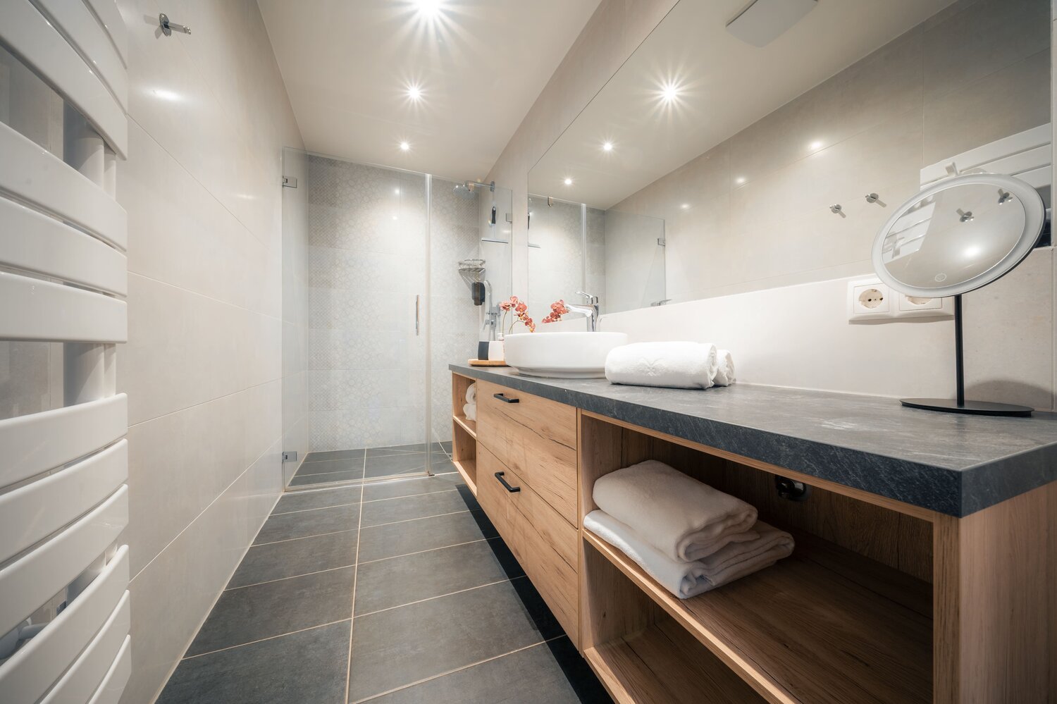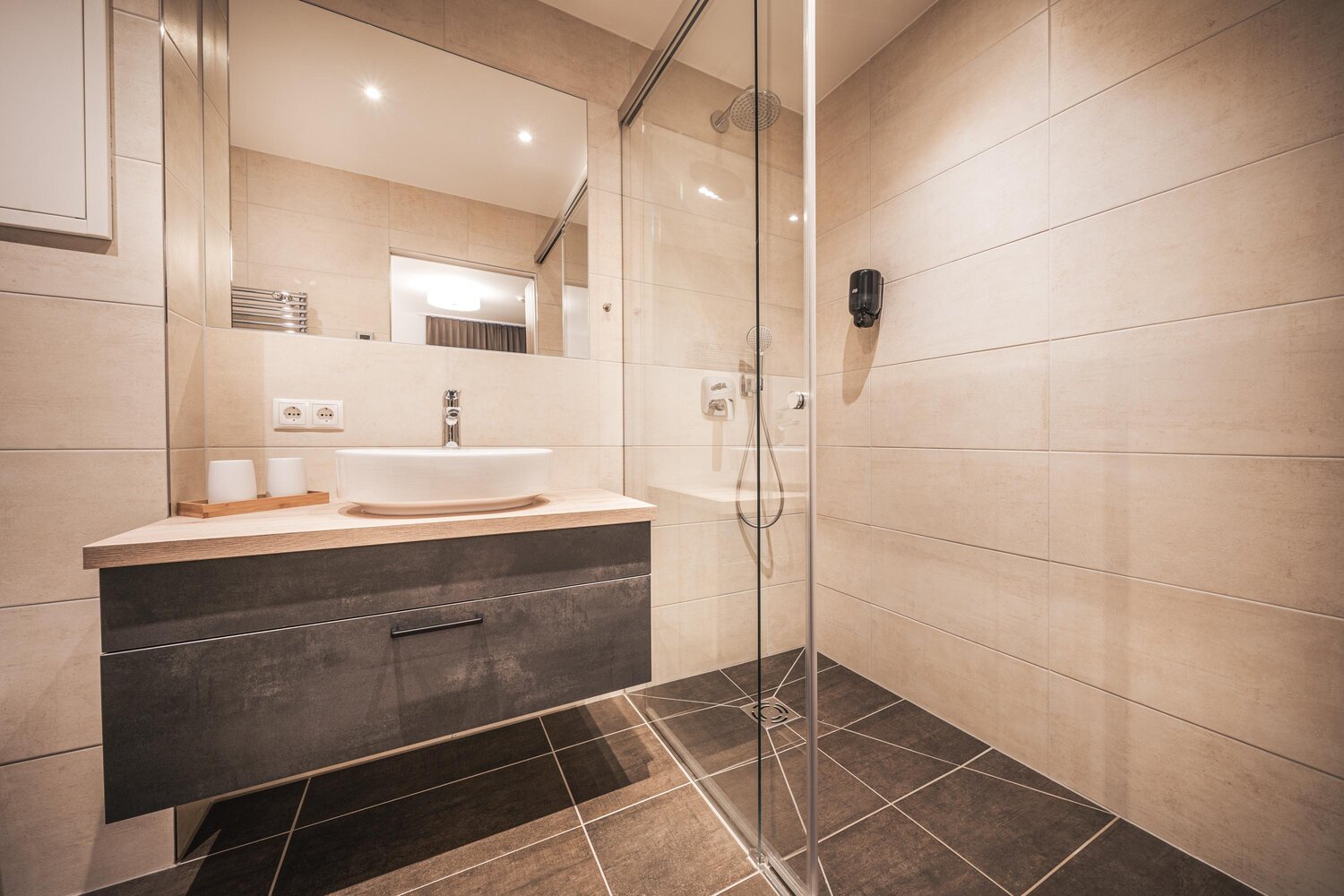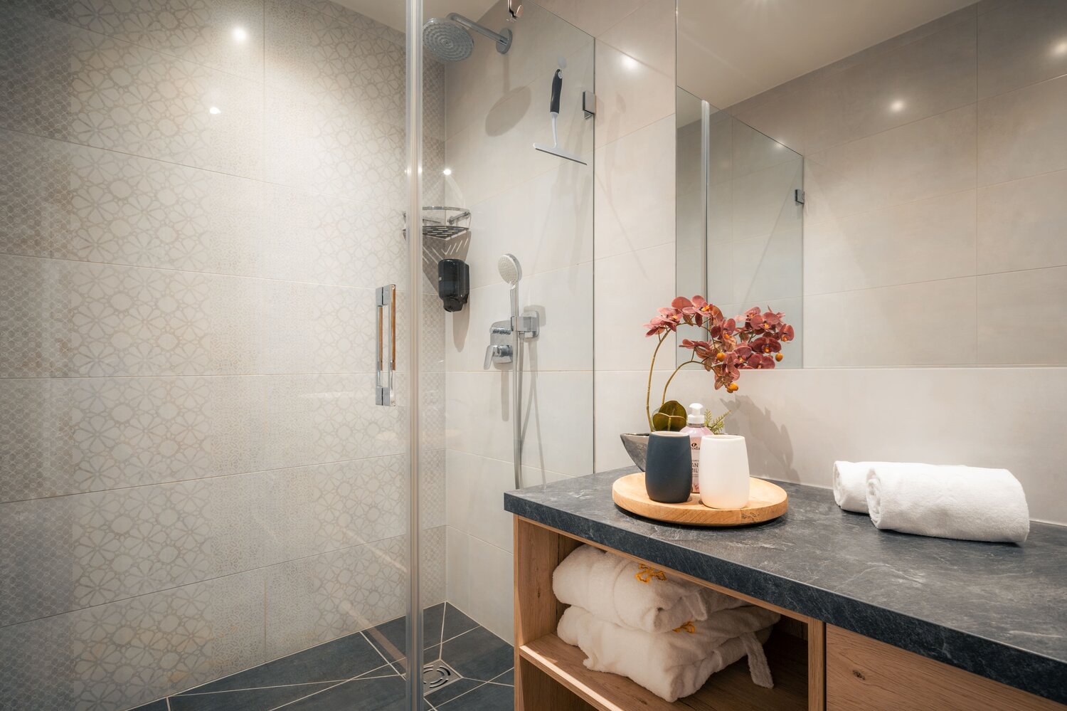 • 2 Bäder mit Regendusche und Waschtisch