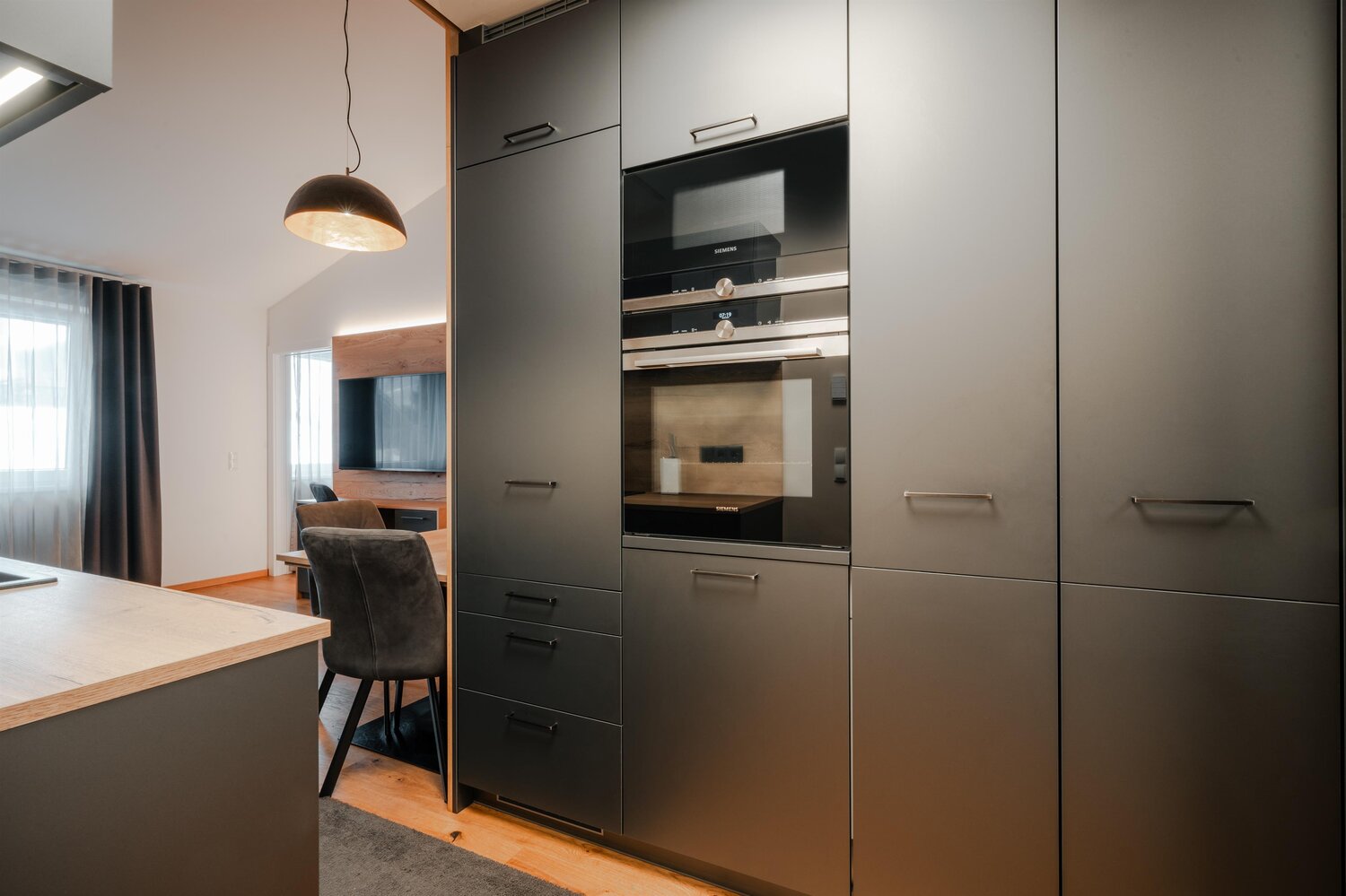 Moderne Küche mit dunklen Schränken, Holzboden und Esstisch.