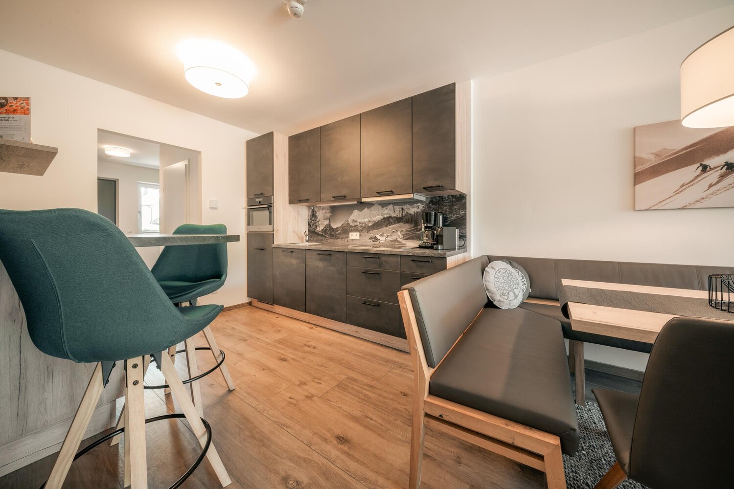 Offener Wohnbereich mit Esstisch, Sitzbank und Küche