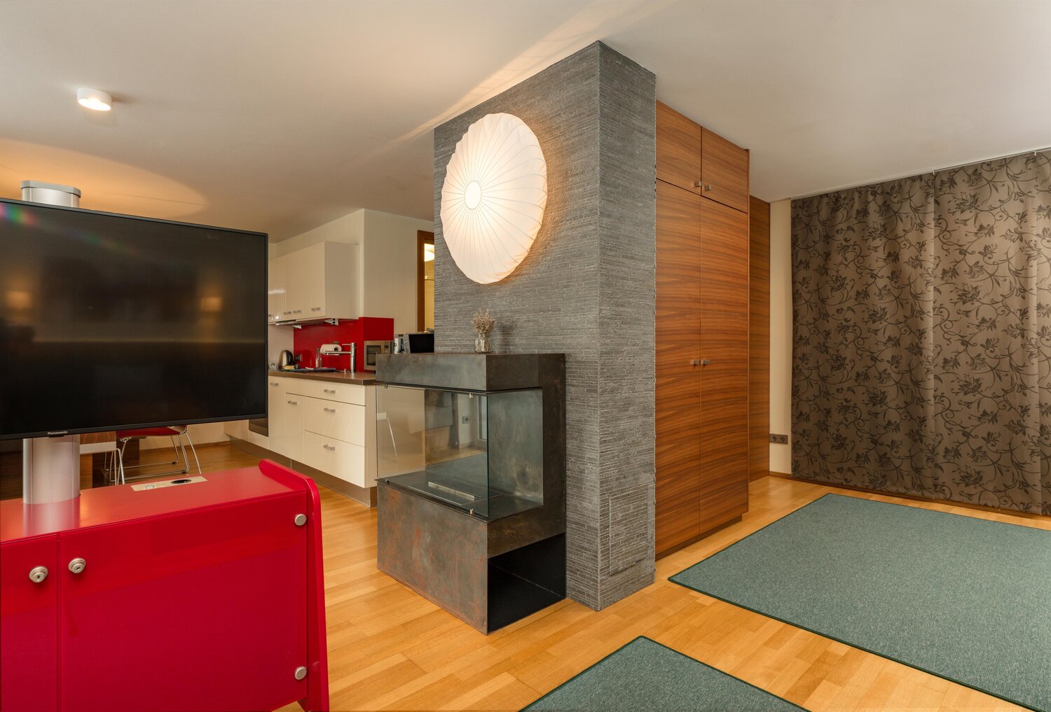 Wohnzimmer mit roter Akzentwand, Kamin und TV-Anlage