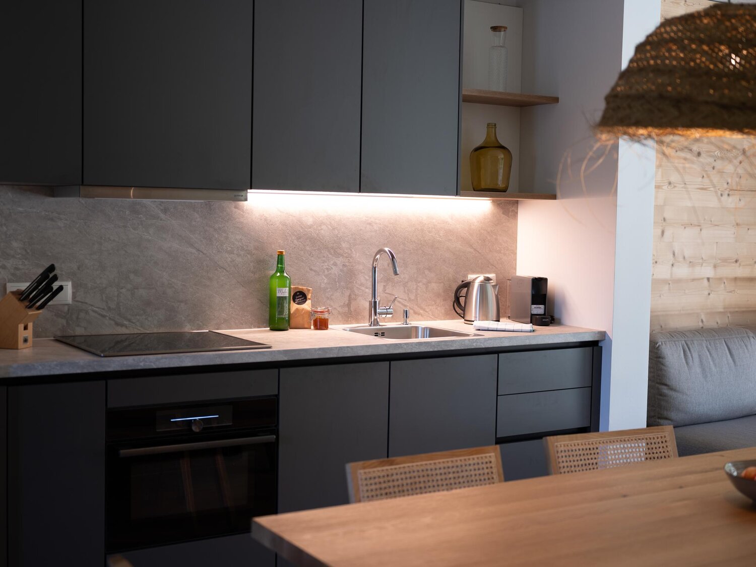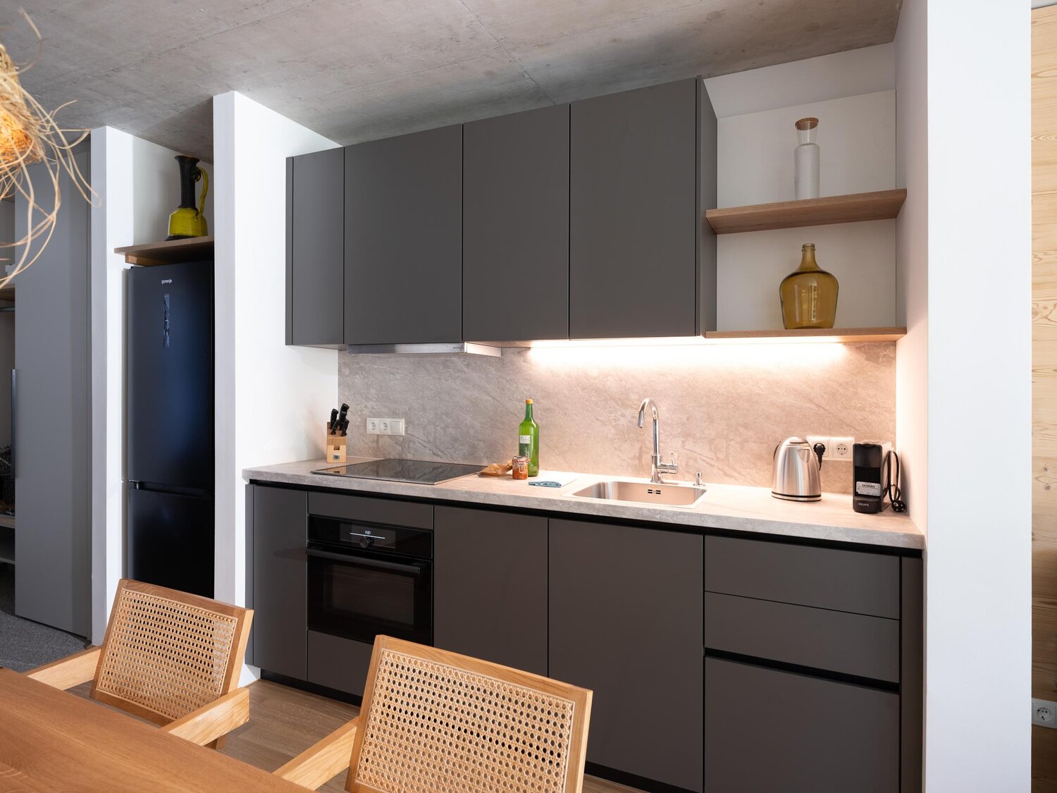 Moderner Küchenbereich mit grauen Schränken und schwarzem Kühlschrank