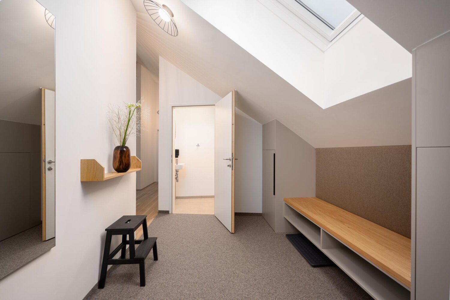 Heller Loft-Wohnbereich mit Dachfenstern, Sofa und Korbmöbel.