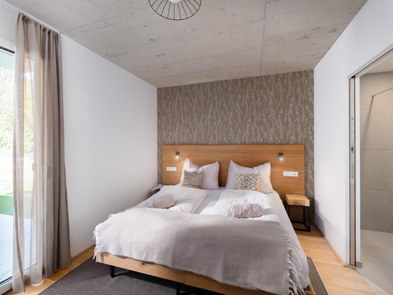 Schlafzimmer mit großem Holzbett und grauer Akzentwand