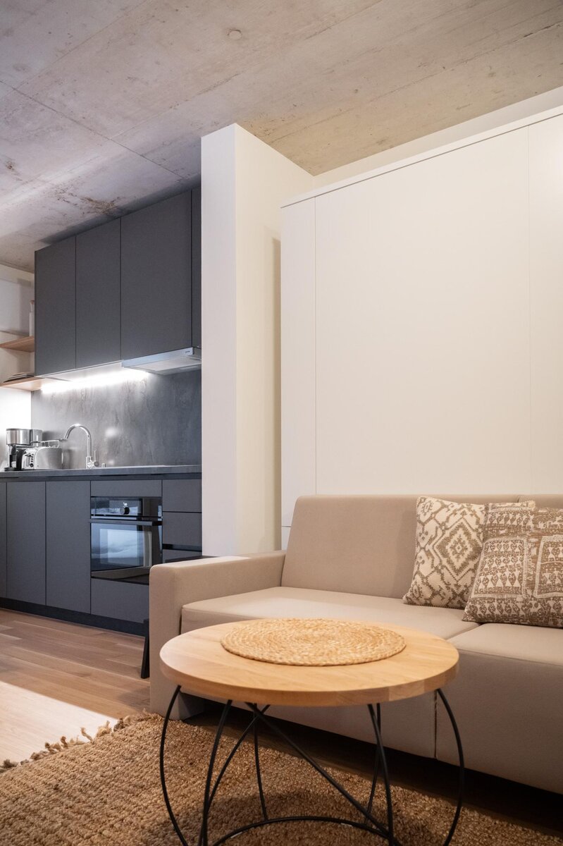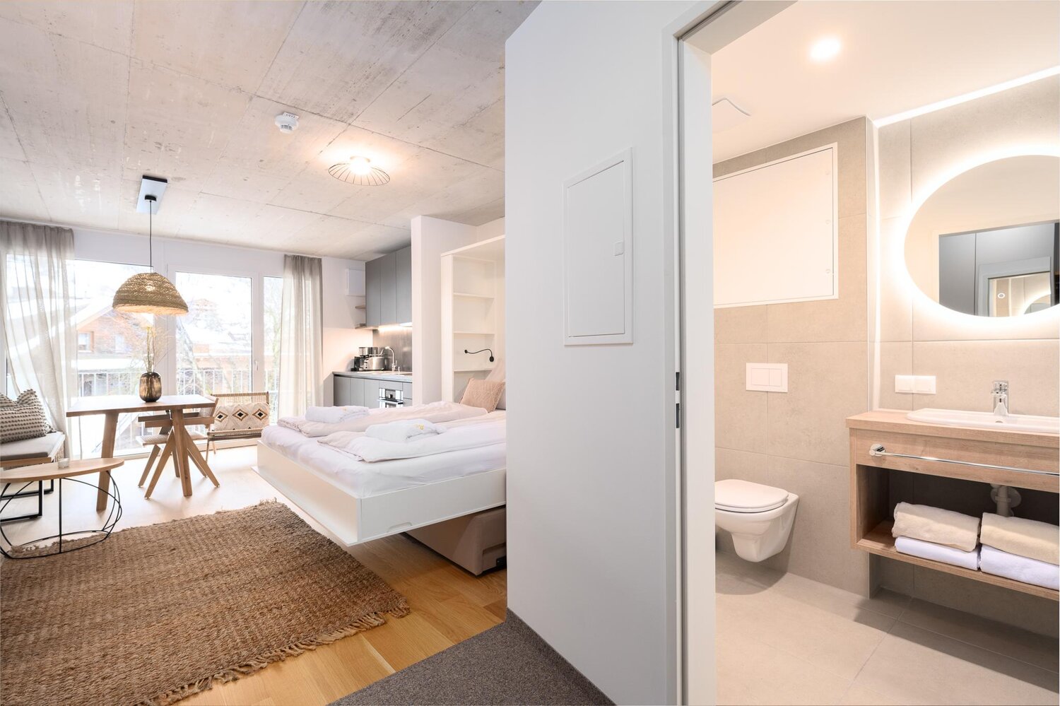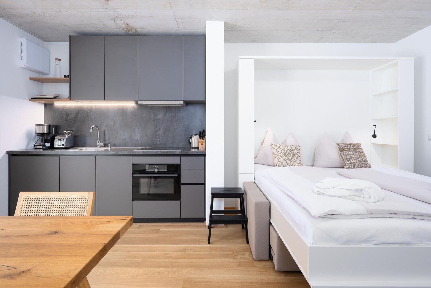 Helles modernes Studio mit Bett, Kochnische und Essecke