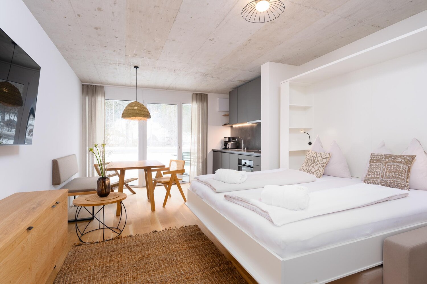 Helles offenes Studio mit Bett, Essbereich und Küche