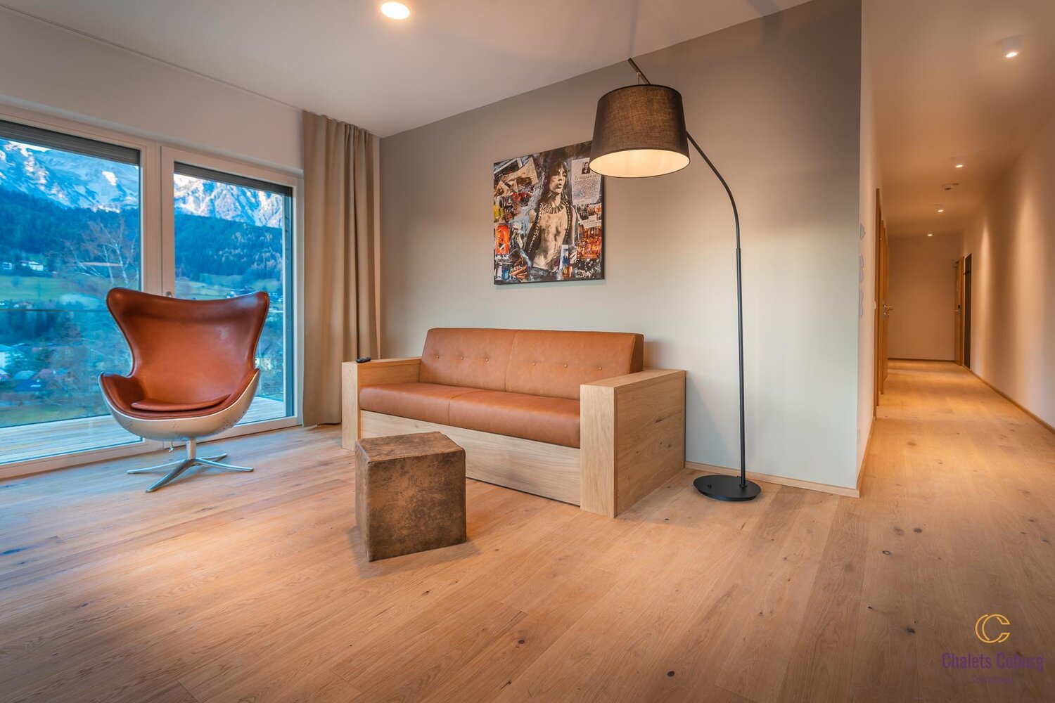 Helles Wohnzimmer mit Ledersesseln und großen Fenstern mit Blick auf schneebedeckte Berge