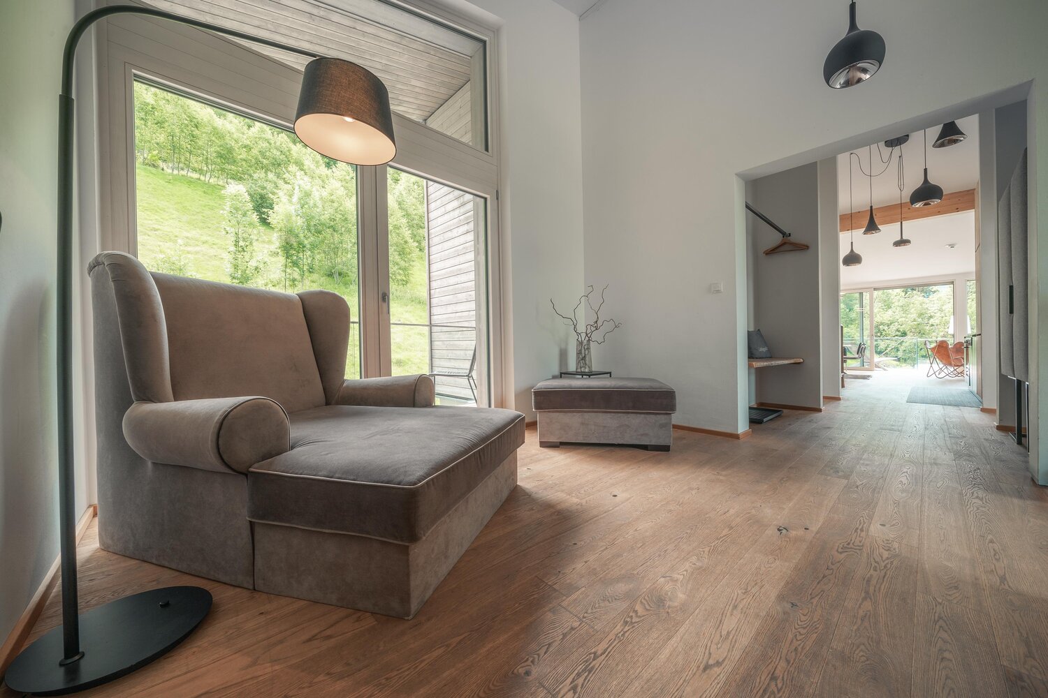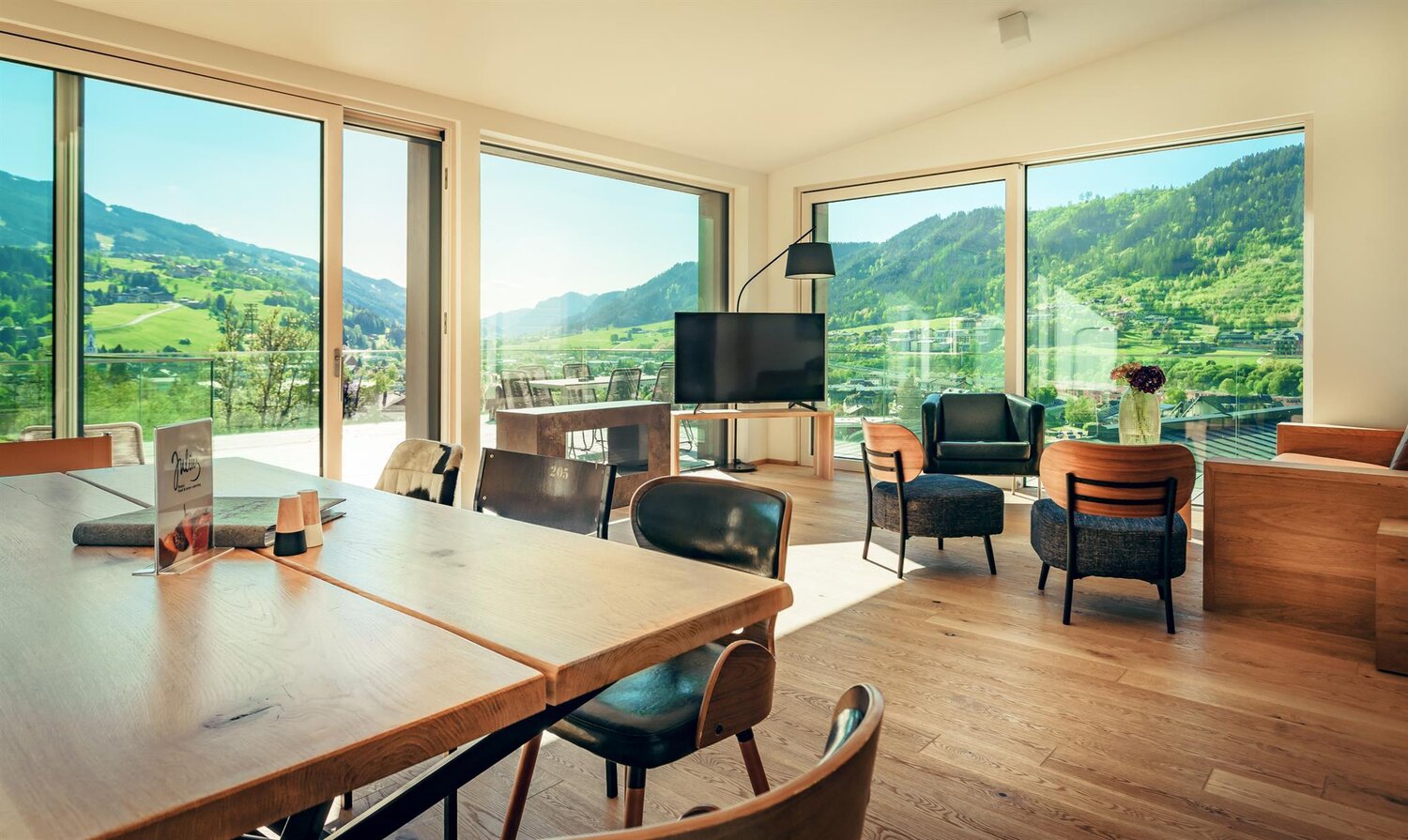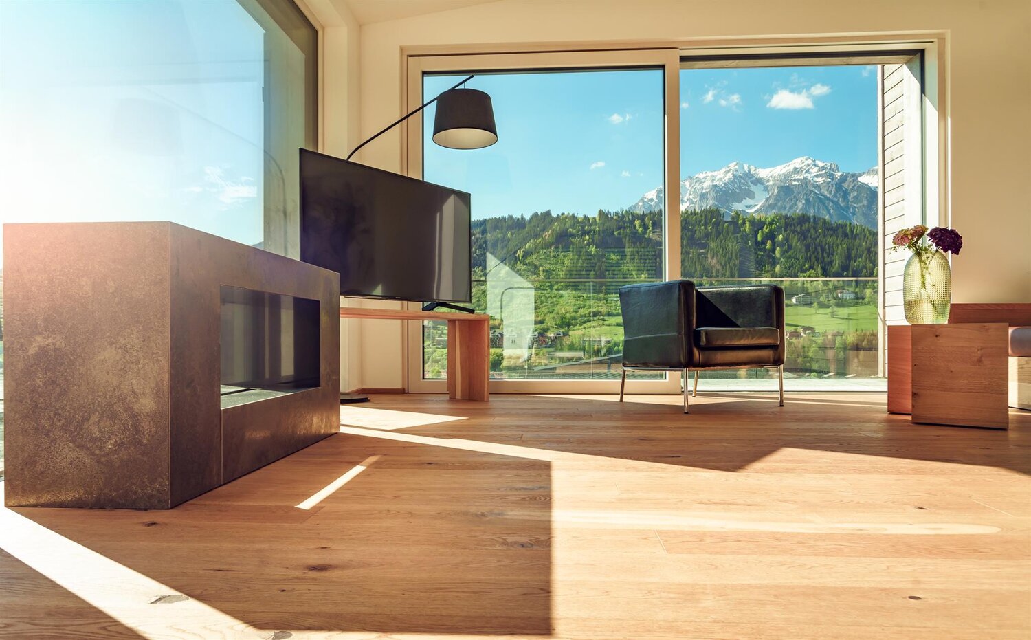 Geräumiger Wohn- und Essbereich mit Holzböden und Bergblick