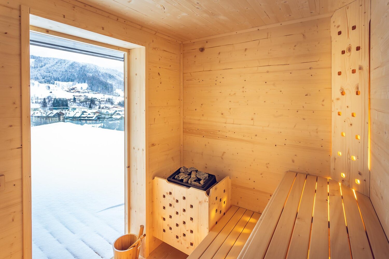 • 1 Privat Spa mit Sauna und Blick auf den Dachstein, Granitwaschbecken und Regendusche sowie einem Einzelbett