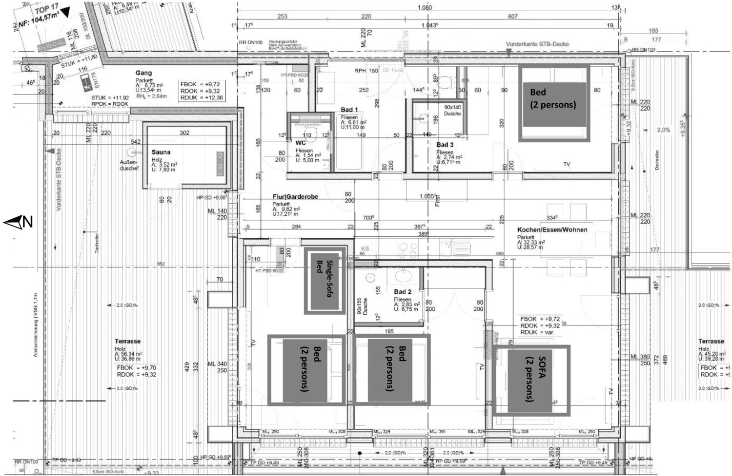 • Vier-Raum Appartement mit einer Raumhöhe von 4 m, mit zwei separaten Schlafzimmern mit je einem Doppelbett sowie einem Einzelbett im privaten SPA-Bereich