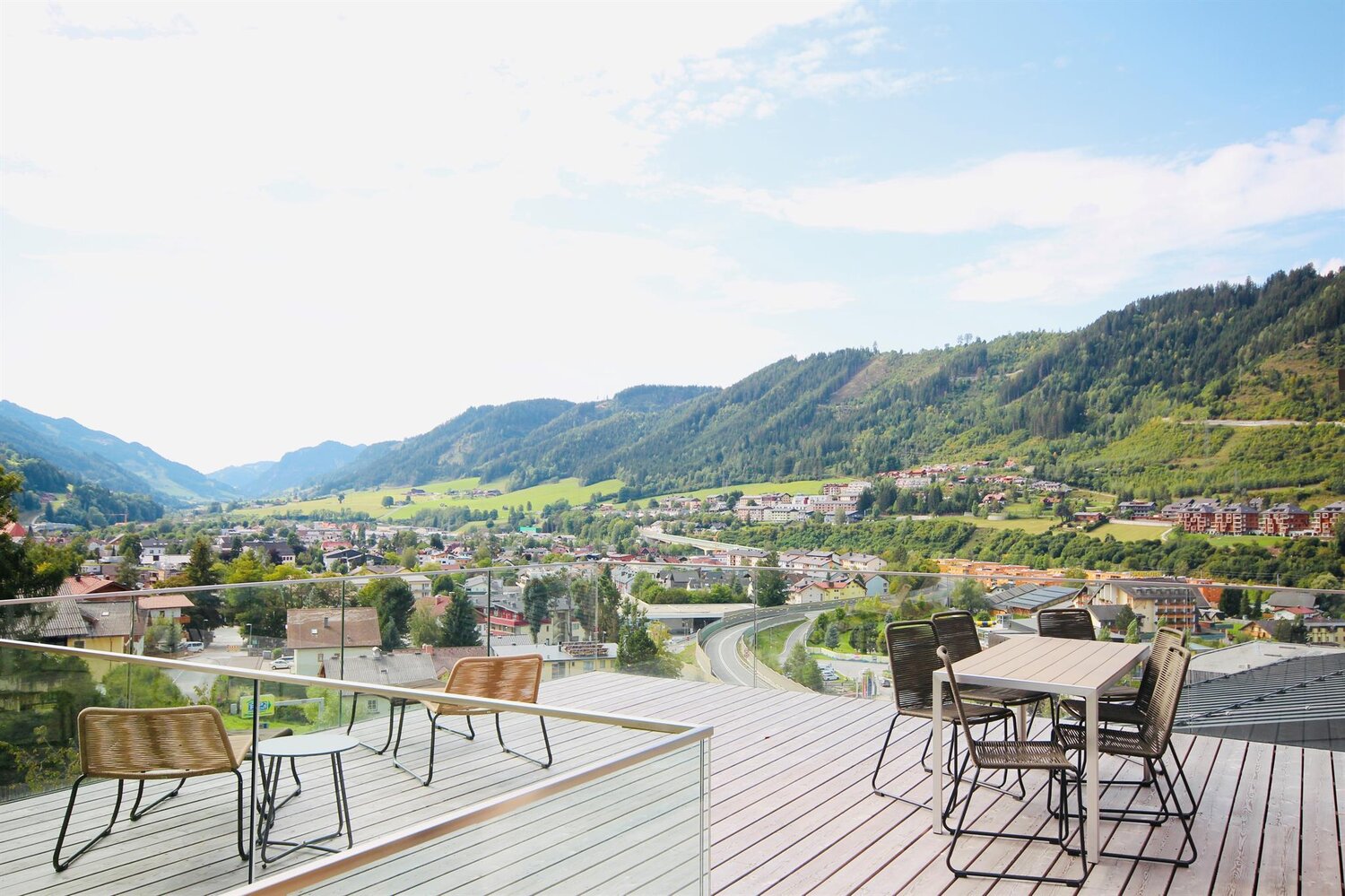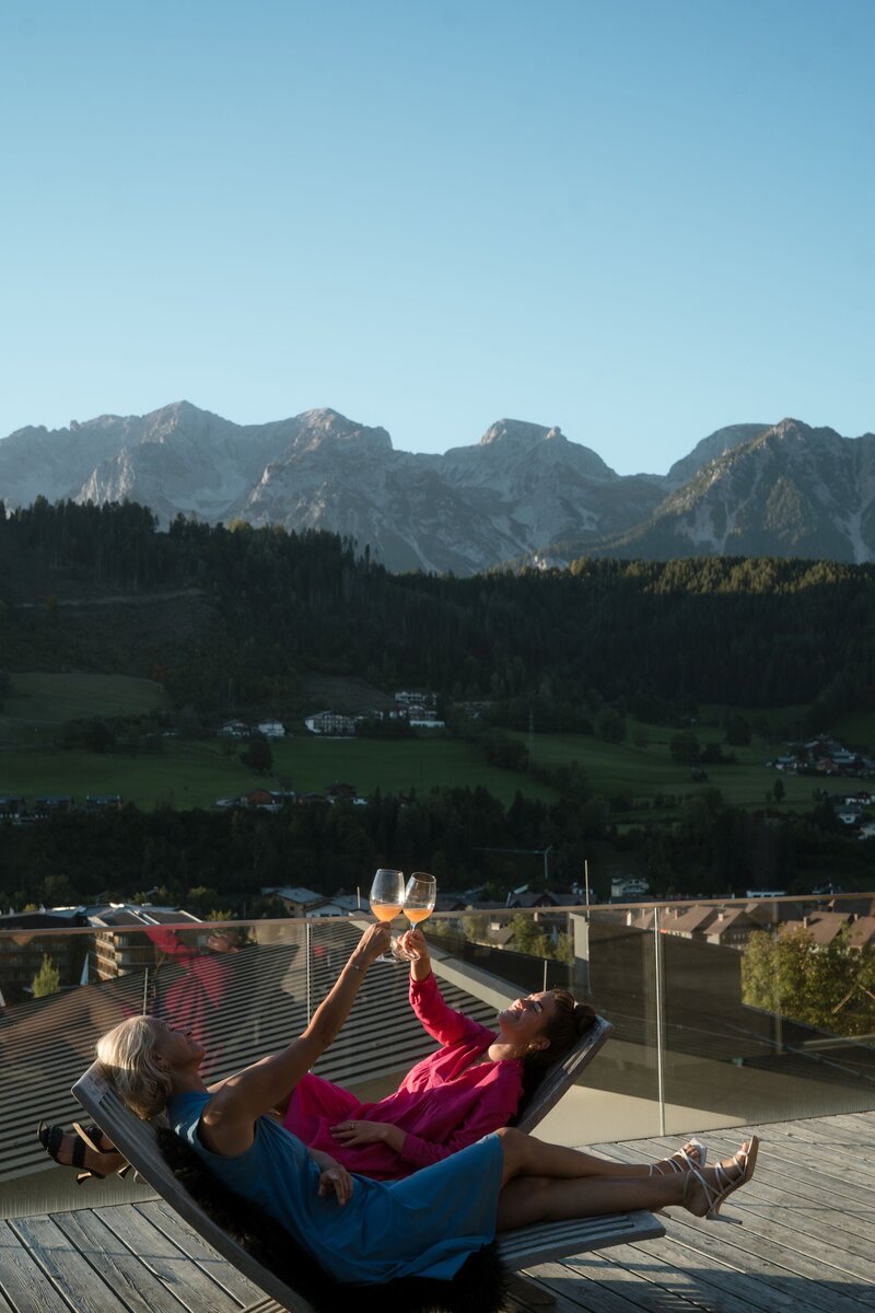 • 1 Privat Spa mit Sauna auf der großzügigen Panoramaterrasse mit Blick auf den Dachstein und ins Ennstal