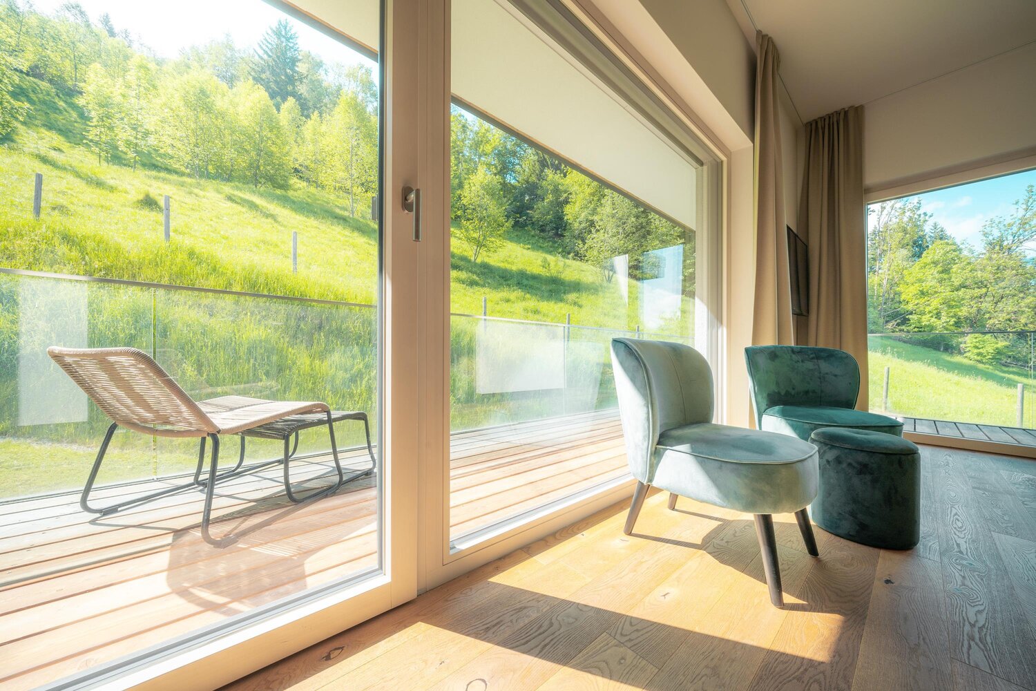 Helles modernes Wohnzimmer mit großen Glastüren und Bergblick.