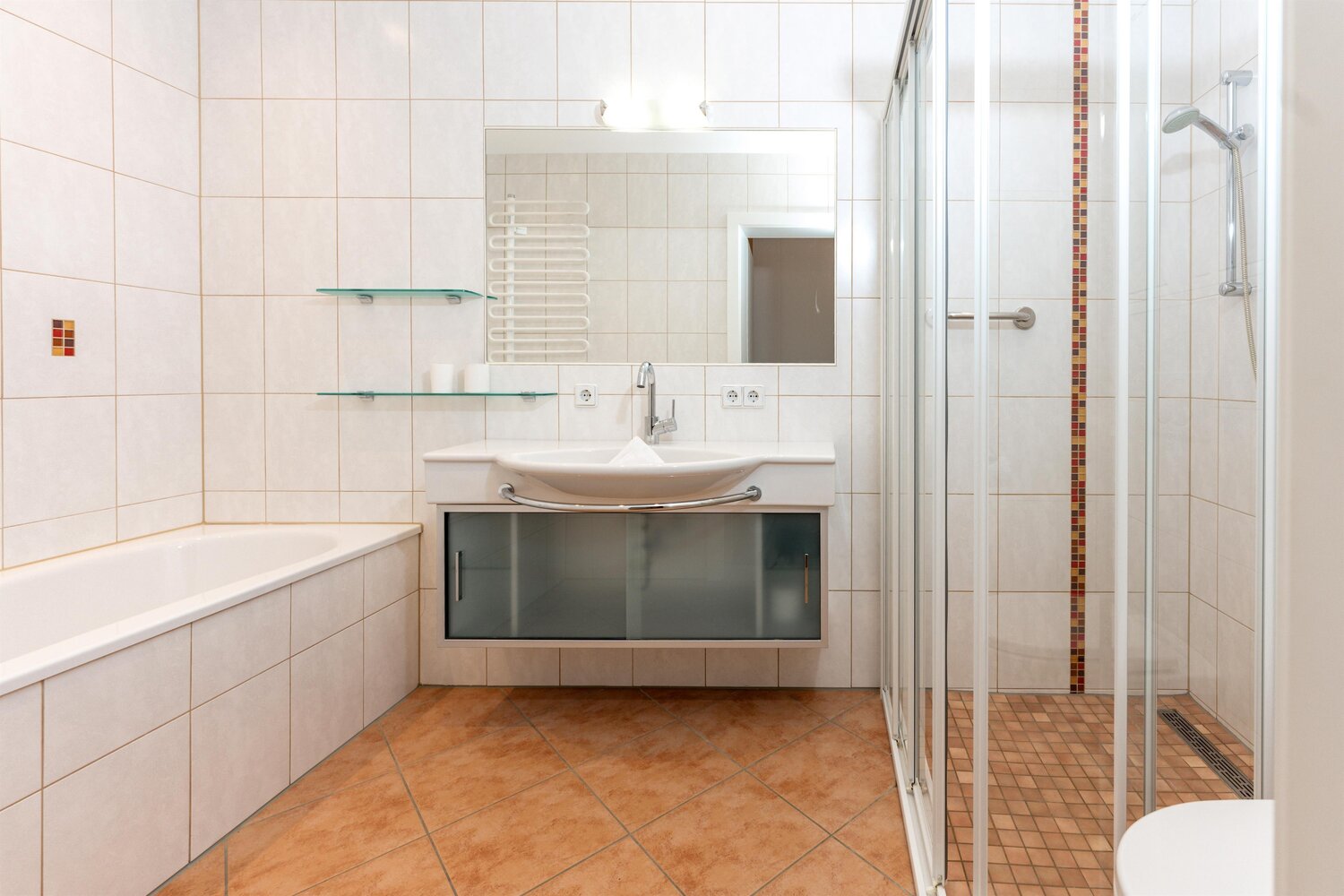 • 1 Badezimmer mit Badewanne, Dusche, Waschtisch und WC