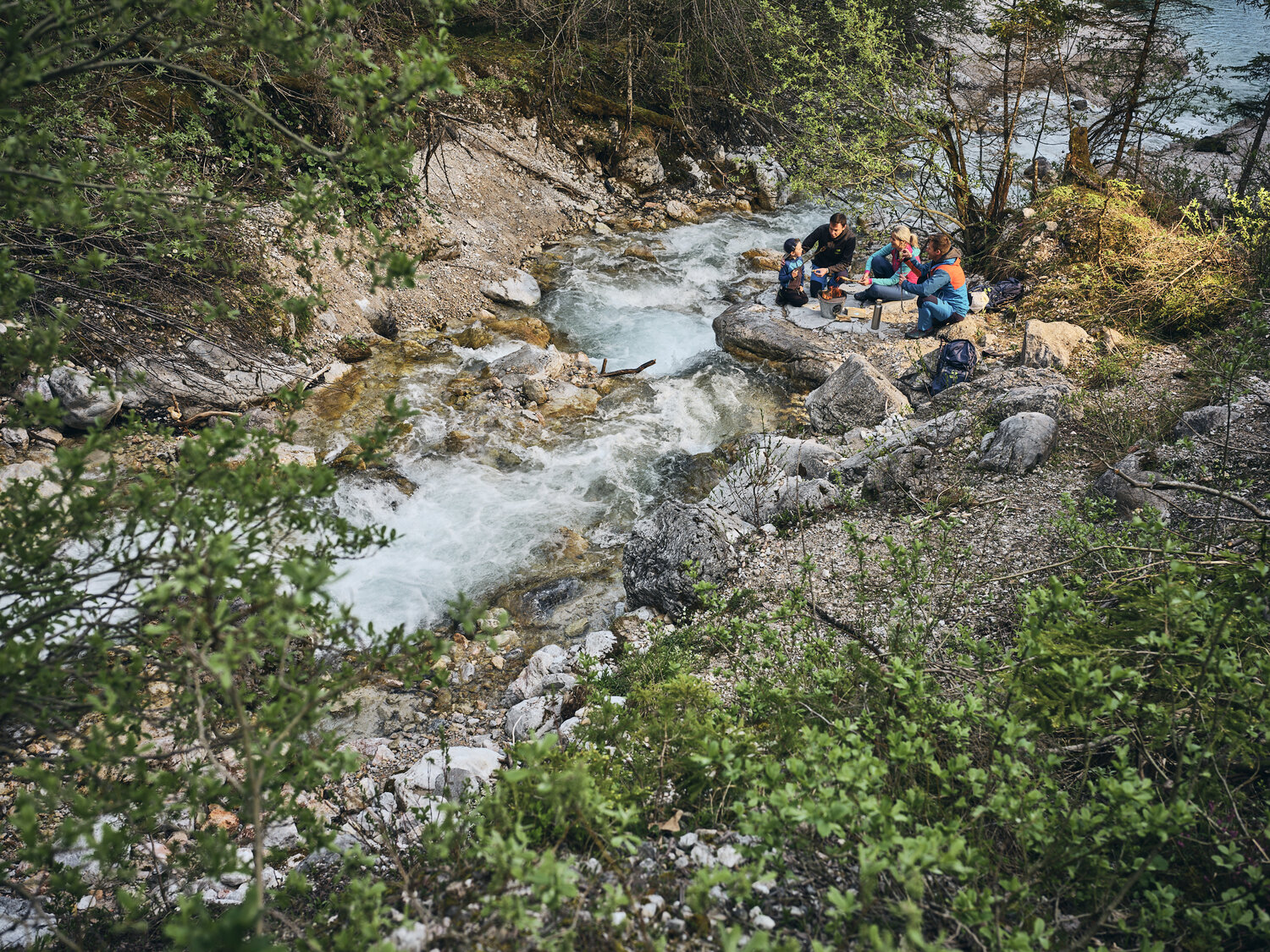 Mädchen planscht im flachen Bach, während ein Mann in der Nähe sitzt. | © RAPHAELGABAUER.COM