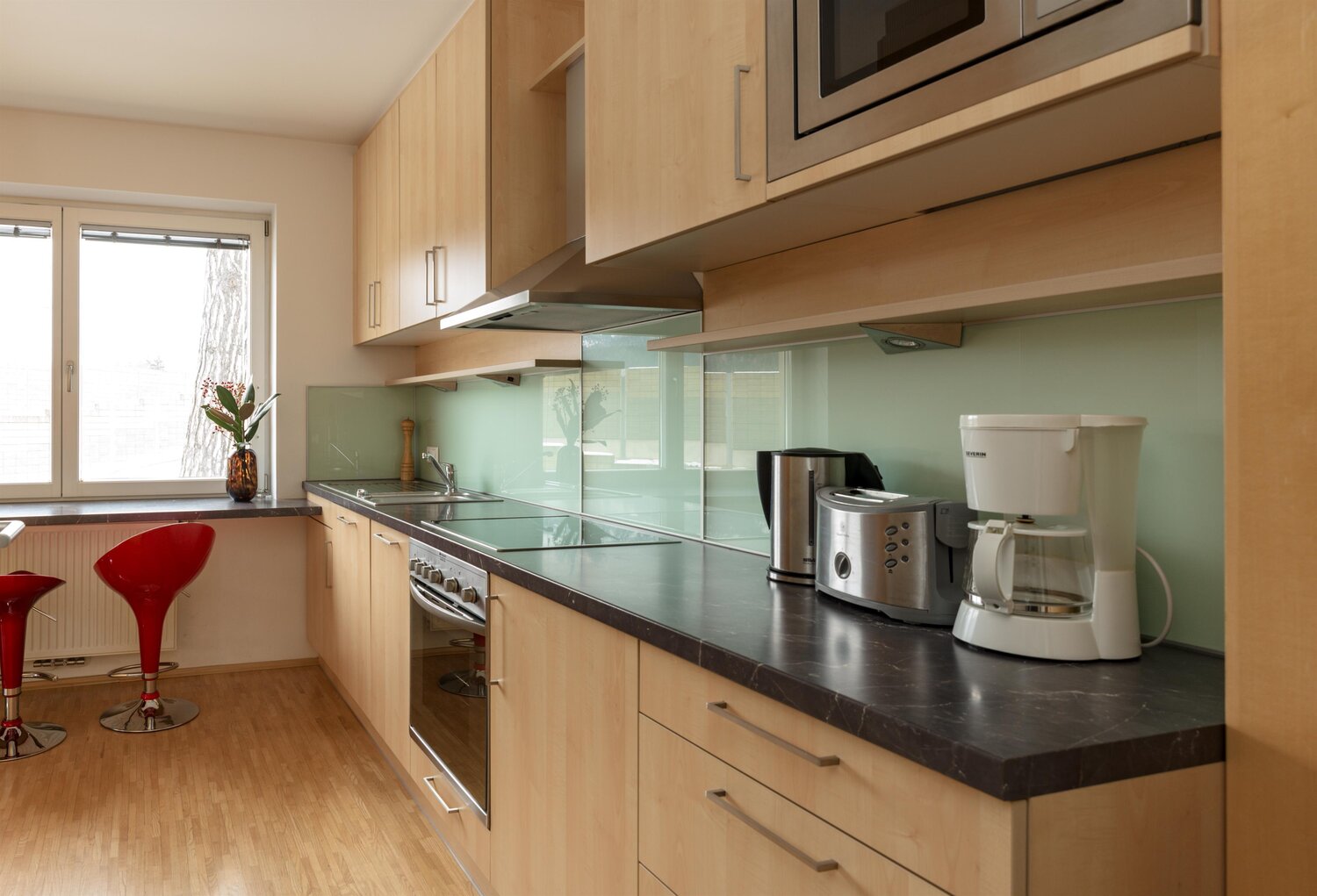 Moderne Küche mit hellen Holzmöbeln, Glasrückwand und Geräten