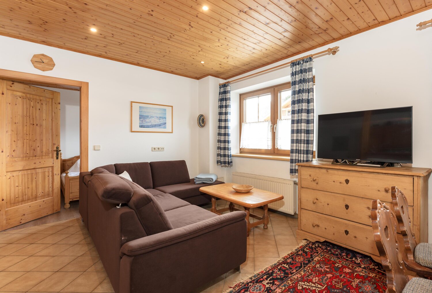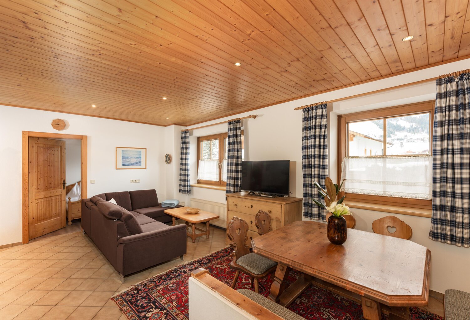 Gemütlicher Wohn- und Essbereich mit Holzdecke