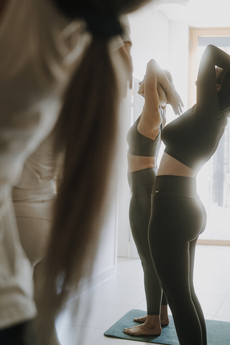 Woman in light athletic wear performing a yoga stretch with raised arm